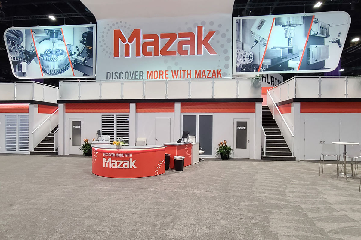 The large overhead Mazak sign gave them the visual impact they wanted. Air conditioned conference rooms on the first floor allowed for private meetings. The second floor deck had a central space with a bar and pub tables for drinks and casual conversations. Two smaller open air spaces were located on the left and right end of the second floor for larger semi-private gatherings.