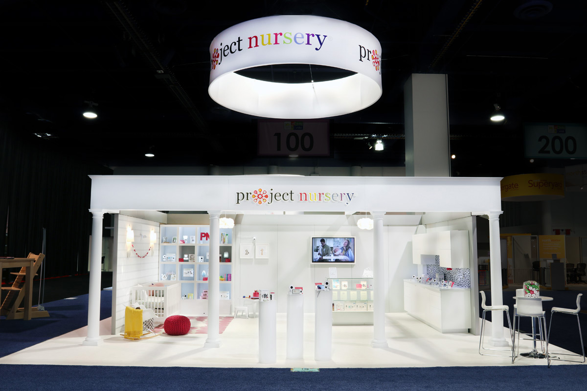 Downing Displays was tapped to design and fabricate a custom rental exhibit that would not only reflect the streamlined aesthetic of the Project Nursery brand, but also help launch their new technology. Used at ABC Kids and the Juvenile Products Manufacture Association (JPMA) shows, the clean, sophisticated exhibit design included two vignettes, a child’s room and a kitchen, plus additional kiosks to showcase the products and new technology in a real-life setting.